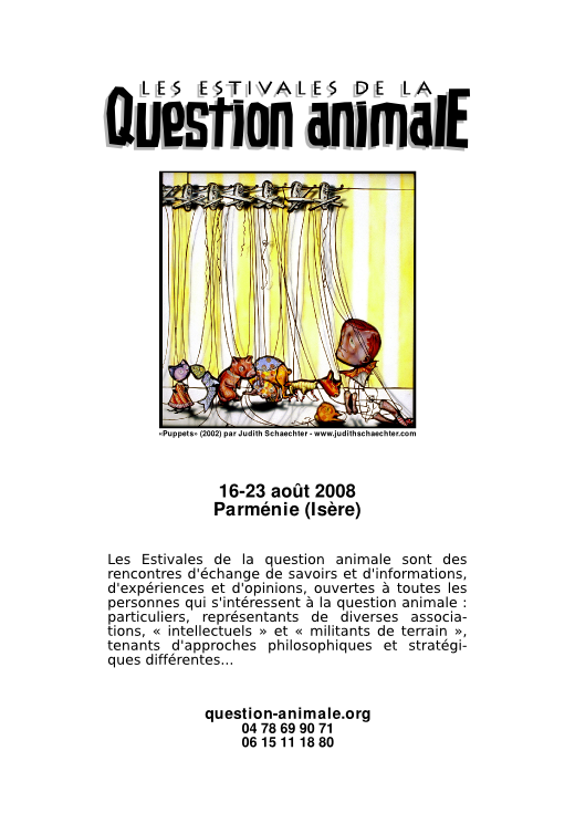 Les Estivales de la question animale 2008 se sont déroulées du 16 au 23 août dans le centre de Parménie en Isère. Soixante-quinze personnes ont participé à cette septième édition.