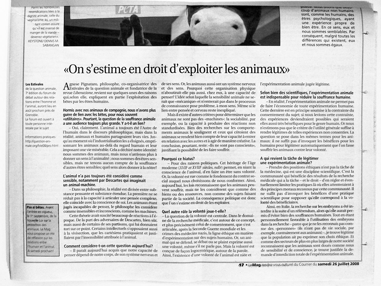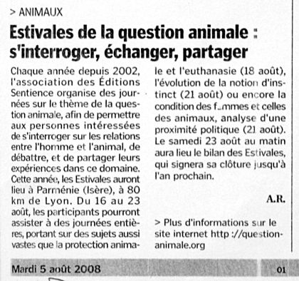 Chaque samedi de l'été 2008, Le Courrier consacrait un dossier de deux pages à la question animale, suite aux lois suisses récentes sur le traitement des animaux.