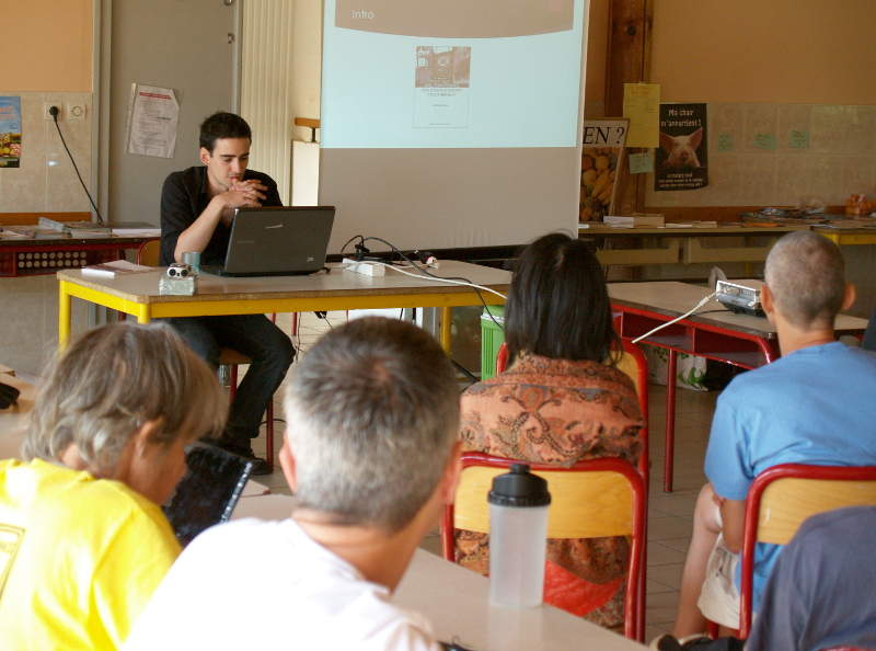 Je suis militant depuis six ou sept ans avec l'association DDA et je fais une thèse sur la répression des droits des animaux dans le monde (?). J'ai publié Militantisme, politique et droits des animaux. Je me suis intéressé à ce sujet car je pense qu'il est nécessaire pour le mouvement français de se politiser. La perspective de changer les mentalités et les comportements individuels n'est pas suffisante. La plupart des gens ne mettent pas forcément en pratique leurs convictions quand elles influent sur leur consommation. L214 a fait un sondage sur le foie gras et presque la moitié des sondés se disaient opposés au gavage alors que 5% seulement boycottaient le produit.