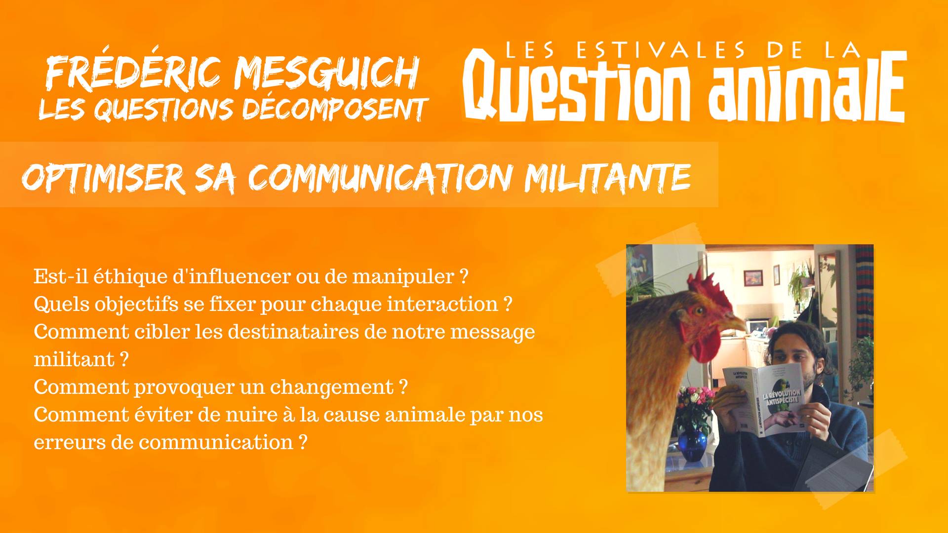 Est-il éthique d'influencer ou de manipuler ? Quels objectifs se fixer pour chaque interaction ? Comment cibler les destinataires de notre message militant ? Comment provoquer un changement ? Comment éviter de nuire à la cause animale par nos erreurs de communication ?