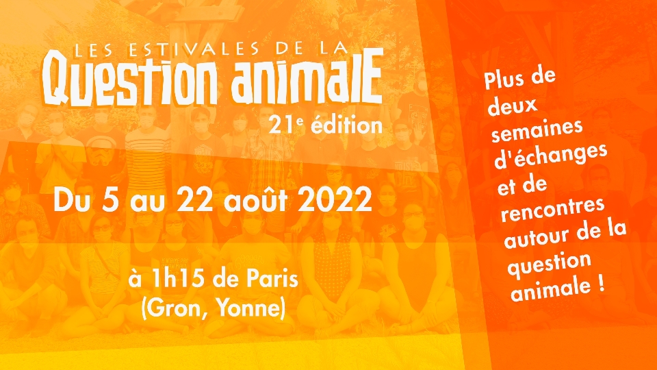 La vingt et unième édition des Estivales de la question animale a eu lieu du vendredi 5 au lundi 22 août 2022 à la Maison Familiale et Rurale du Sénonais à Gron dans l'Yonne (à 110 km au sud de Paris). La gare la plus proche, Sens, était accessible en 1h en TER depuis Paris Bercy.