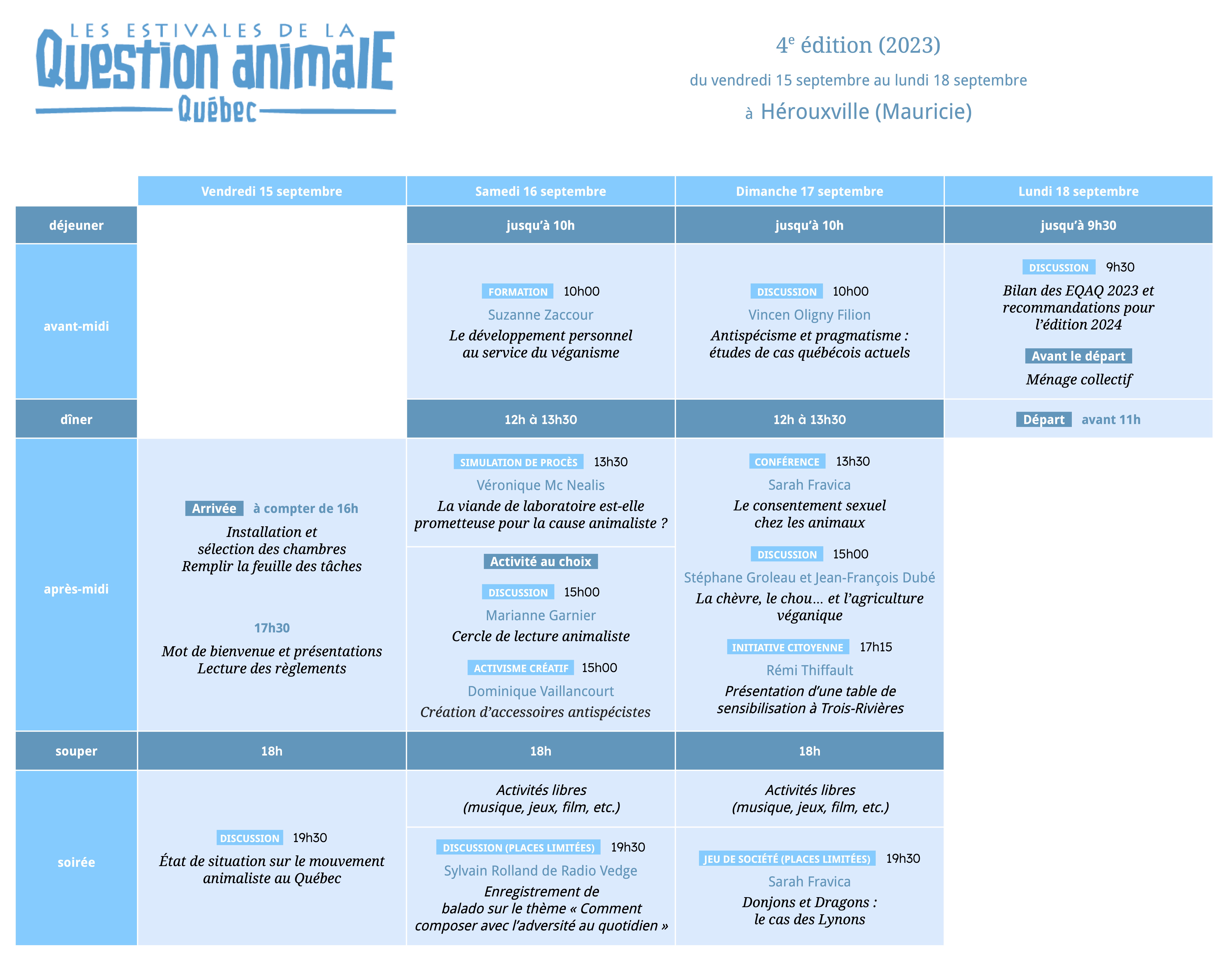 La cinquième édition des Estivales de la question animale au Québec aura lieu du 30 août au 2 septembre 2024 à Hérouxville, en Mauricie. Les détails pour participer aux Estivales sont disponibles sur le formulaire d'inscription. Ne tardez pas trop, les places sont limitées!