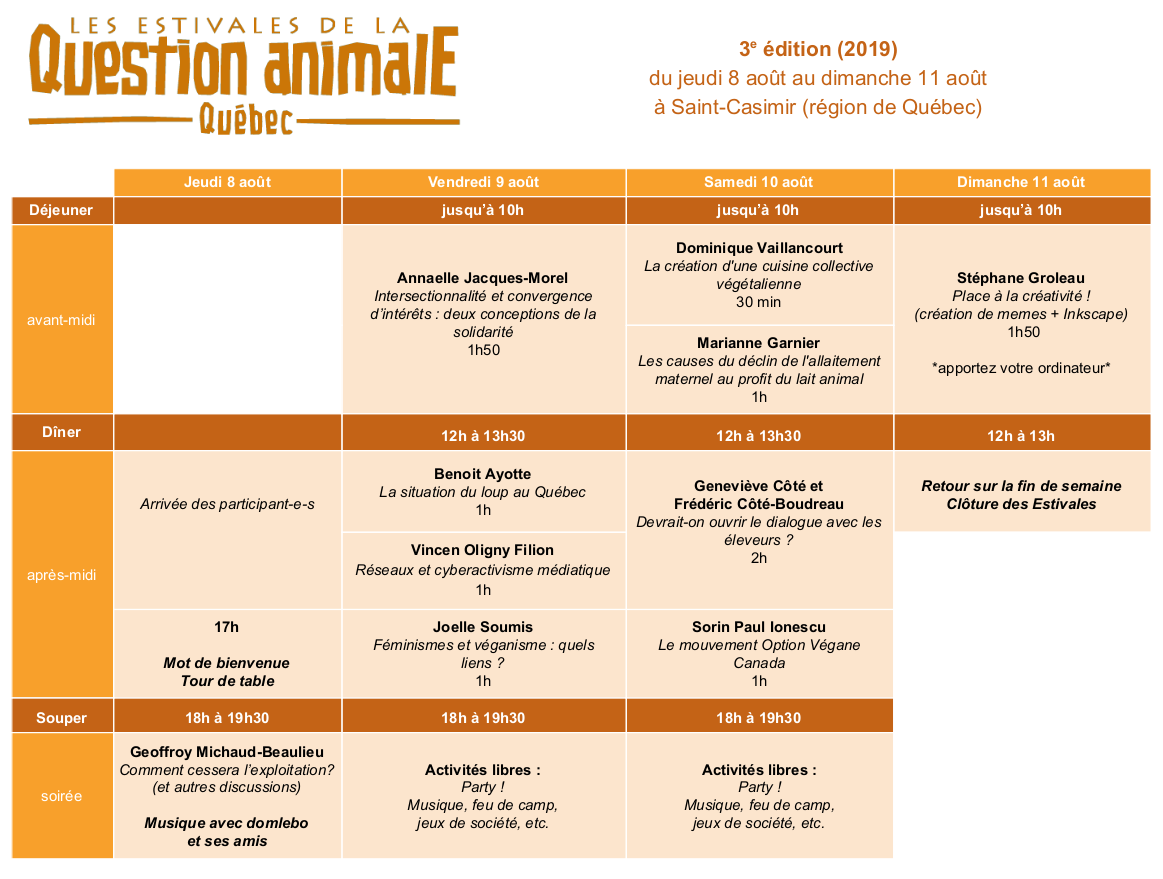 L'édition 2019 des Estivales de la question animale au Québec a eu lieu du 8 au 11 août à Saint-Casimir (région de Québec).